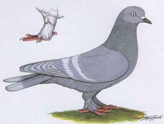 kräftige, lange, mittelhoch gestellte Taube mit fast waagerechter Haltung, Gabelschwanz, behost, glattköpfig, sehr gute Trommelstimme.